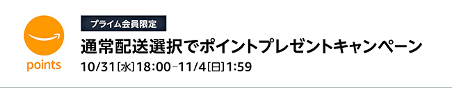 総合オンラインストアのAmazon.co.jpは、10月31日18時から11月4日1時59分注文分まで、プライム会員向けに、本来なら無料で利用できる「当日お急ぎ便」「お急ぎ便」「マケプレお急ぎ便」を利用せず、通常配送を選択すると、配送1件につき30ポイントをプレゼントする「通常配送選択でポイントプレゼントキャンペーン」を実施している。