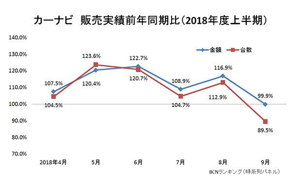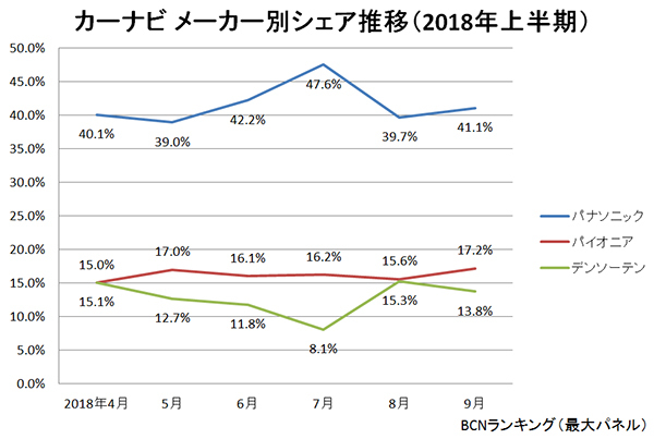 18年度上半期のカーナビ市場全体をみると、9月を除き、ほぼ前年を上回る販売実績を残している。メーカー別シェア推移では、パナソニックが首位を独走する一方で、パイオニアは5月から2位の座をキープしている。各社ほぼ横ばいで推移しているものの、市場全体が落ち込んだ9月のパイオニアのシェアは、上半期で最も高い17.2%を獲得。3位のデンソーテンとの差を広げた。