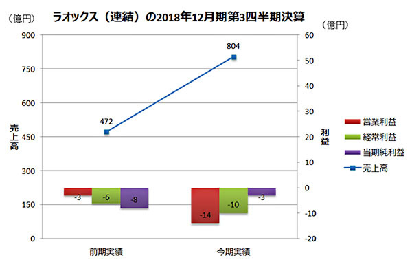 ラオックスが11月14日に発表した2018年12月期第3四半期の連結決算は、売上高が803億5000万円(前年同期比70.4%増)、営業利益は13億8100万円の赤字、経常利益は9億9700万円の赤字、親会社株主に帰属する四半期純利益は3億2300万円の赤字だった。業績悪化は新事業への投資が先行したのと、自然災害の影響が大きいという。