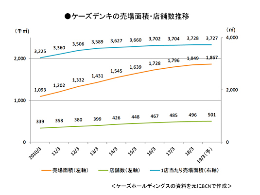 ケーズデンキの出店は、いきなり飛び地に新規出店するのではなく、既存店舗と商圏が一部重なるような地続きで出店するのが特徴だ。今後も、そうした形で都市部周辺の住宅が集中しているエリアに出店していく姿勢を変えないが、売場面積はやみくもに広げるのではなく、3700平方メートル前後を維持する形の、ケーズらしい“頑張らない”出店が増えそうだ。(BCN・細田 立圭志)
