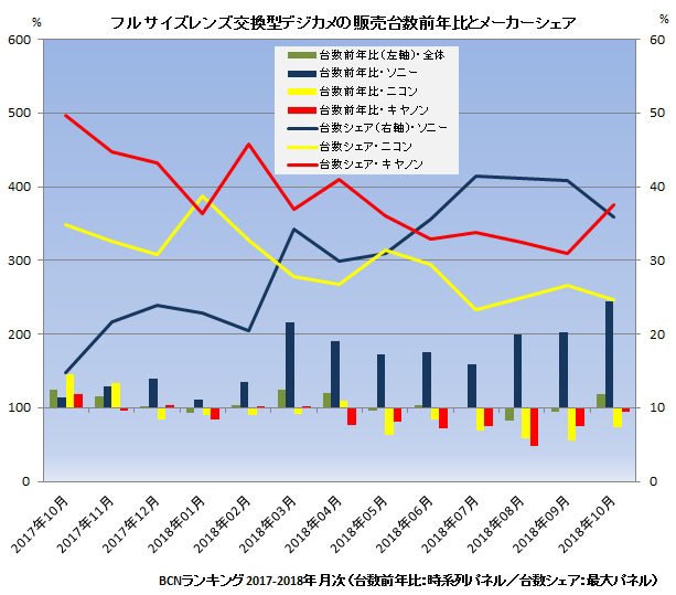9月にニコンが「Z7」、10月にキヤノンが「EOS R」と、それぞれ新マウントをひっさげてフルサイズのミラーレス一眼を発売。両社とも激しく縮小する一眼レフをミラーレス一眼で食い止めようとしているが、10月時点ではまだ、フルサイズレンズ交換型デジカメで、両社ともマイナスが続いている。