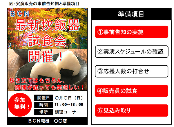 実演販売の準備項目の中でも、特に重要なのが「事前告知」だ。試食会は、来店客数のアップを狙える数少ないイベントの1つなので、顧客に「来週は試食会をやるのか」「そういえば炊飯器もそろそろ買い替えどきだな」という認識を持ってもらうために、店内のポスターはもちろんのこと、ツイッターなどのSNSやメルマガで事前に情報発信することが大切だ。
