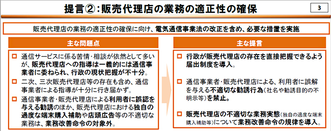 提言では、行政が間接的ではなく直接的に代理店の存在を把握できるように、総務省の認可を必要とする「届出制の導入」を示した。販売店独自の過度な端末導入補助などの不適切な業務実態に対して、業務改善命令の規律の導入も視野に入れる。