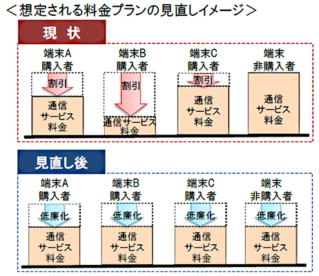 また、問題点の一つとして、端末購入から一定期間で通信料金の割引が終了すると、その後は通信料金が上昇し、それを抑えるために必要以上に新規端末の買い替えを誘因していることをあげている。