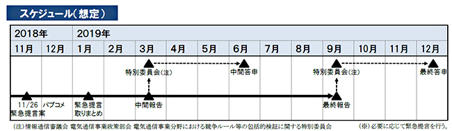 モバイル研究会では今後、12月にパブリックコメントの募集を行い、19年1月に緊急提言を取りまとめ、3月に情報通信審議会の特別委員会に中間報告をする。特別委員会の最終報告は9月、特別委員会の最終答申は12月というスケジュールを予定している。