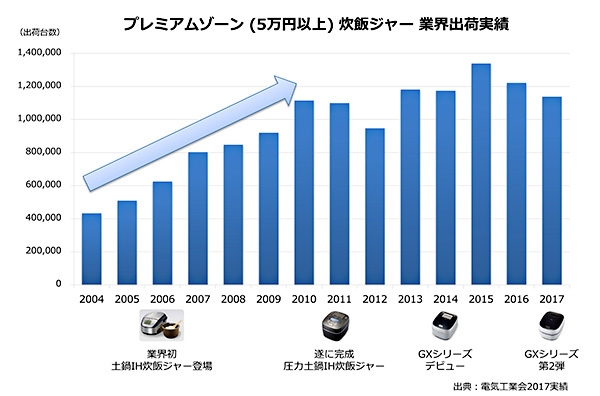タイガー魔法瓶でも2006年度に業界初の「土鍋炊飯ジャー」を発表して以来、人気商品のひとつとなっているが、家電エコポイントの追い風やインバウンドによる「爆買い」も手伝って、15年度のピーク時には年間130万台、現在でも約100万台の高級炊飯器が出荷されている。