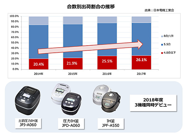 実際に市場動向をみても小容量タイプが増えており、4合以下の炊飯器の構成比は14年の20.4%から17年に26.1%まで伸びている。4台に1台が小容量タイプというわけだ。タイガーでも、18年の新モデルとして、3.5合炊きの土鍋圧力IH炊飯ジャー JPJ-A060、圧力IHタイプのJPD-A060、ならびに3合炊きのIH炊飯ジャー JPF-A550の3機種を一気に投入した。