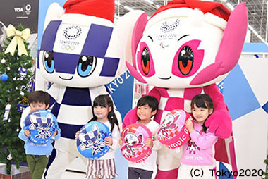 朝10時のオープンに先立ち、メディア向けオープニングイベントでは、東京2020の公式マスコットキャラクター「ミライトワ」と「ソメイティ」が、サンタ帽子をかぶった冬の装いで登場。さらに、4名の子どもたちとともにクリスマスツリーに飾り付けたり、ポーズをとったり、愛くるしい動きを披露した。