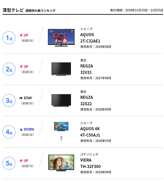 全国の主要家電量販店・ネットショップのPOSデータを集計した「BCNランキング」でも、11月19~25日の1週間に売れた液晶テレビのトップ10のうち、4機種が4Kテレビだった。最上位は4位で、シャープが2018年3月に発売した50型「AQUOS 4K AT-C50AJ1」だった。
