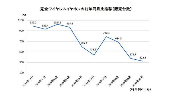 全国の主要家電量販店・ネットショップのPOSデータを集計した「BCNランキング」によれば、完全ワイヤレスイヤホンの販売は好調だ。前年同月と比べて、今年1月と2月が9倍強、3月が10倍以上と最もピークに達し、10月は以前ほどの伸びではないものの、3倍以上を記録している。