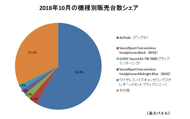 完全ワイヤレスイヤホンの中で、最も売れているのはアップルの「AirPods」。10月の機種別販売台数シェアでは、58.4%と圧倒的なシェアを獲得してトップとなっている。続いて、2位がBOSEの「SoundSport Free wireless headphones Black」で3.2%、3位がソフトバンクの「GLIDiC Sound Air TW-5000 ブラック」で2.4%などと続く。