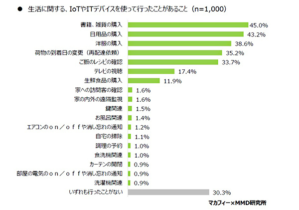 調査によれば、IoTデバイスやITデバイスで最も利用経験が多かった(複数回答可)のは「書籍、雑貨の購入」で45.0%、次いで「日用品の購入」「洋服の購入」と、ECサイトでの商品購入で利用するケースが多かったという。家電の操作や自宅の防犯、家事での利用については、2%に満たなかったとのことだ。