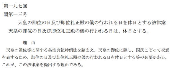 12月4日、特別法案「天皇の即位の日及び即位礼正殿の儀の行われる日を休日とする法律案」が衆議院で可決した。参議院でも可決され、法案が成立すると来年、2019年は、土日を含め、4月27日から5月6日まで10連休となる。