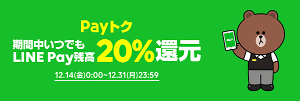LINE Payは、コミュニケーションアプリ「LINE」上のモバイル送金・決済サービス「LINE Pay」で20%還元が受けられる「Payトク」キャンペーンを12月14日に開始した。12月31日までで、キャンペーン参加に事前の申込みなどは不要。5000円分の還元が上限。