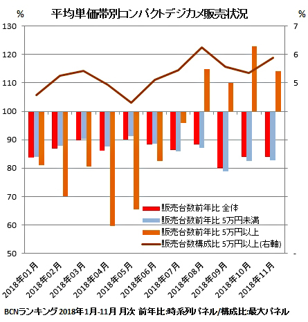 コンパクトデジカメの縮小は進んでいる。全体では販売台数前年比80%前後という厳しい状況だ。しかし、税別平均単価10万円以上の高価格製品を見ると、このところ大きく伸びている。販売台数構成比はわずか2%弱という小さな市場だが、今年に入ってからも、9月には191.6%と2倍近い伸びを示すなど、着実に広がってきた。もう少し範囲を広げ、「5万円以上」を高価格帯とすると、8月以降、2ケタ成長が継続。販売台数構成比も安定的に5%を上回り、6%前後で推移しており、今後の成長市場としての期待が高まっている。