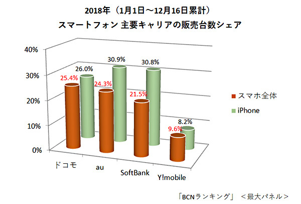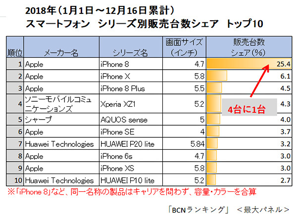 家電量販店の実売データを集計した「BCNランキング」の日次データをもとに、キャリア、容量を合算したシリーズ別集計で、スマートフォンの2018年1月1日~12月16日までの累計販売台数を「2018年(暫定)スマホ販売台数ランキング」(従来型携帯電話は含まない)とすると、期間中、最も多く売れた暫定1位はドコモ、au、ソフトバンクが取り扱うAppleの「iPhone 8」で、スマホ全体の約4分の1、25.4%を占めた。