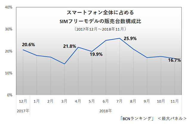 キャリア、容量ごとに別々に集計した機種別ランキングでは、au、ソフトバンクを抑え、ドコモの「iPhone 8」がトップを獲得。4位はSIMフリースマホの「HUAWEI P10 lite」、5位はその後継機種「HUAWEI P20 lite」だった。一時期、2割を超え、18年7月には25.9%に達したSIMフリースマホの構成比は10月17.6%、11月16.7%と、拡大に足踏みがかかった状態だ。