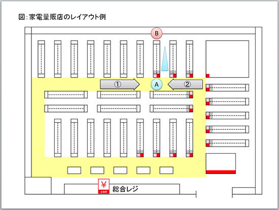 例えば、一般的な家電量販店のレイアウトを考えた場合、入口から100人の顧客が入店すれば、メイン通路に面したAのエンドの前は50人以上が通過するイメージだ。これに対して、メイン通路とは反対側の奥にあるBのエンドは目的買いの顧客がほとんどになるため、15人程度に減少する。この15人の顧客のうちの3人がBに置かれた商品を購入すると仮定すれば、この商品をAのエンドに移すだけで10人が購入するという計算になる。