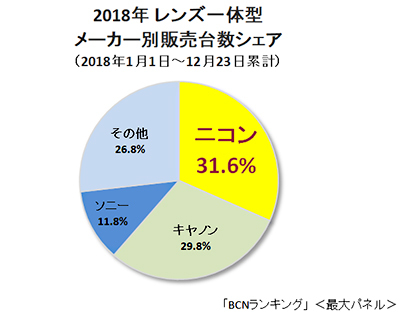 18年1月1日~12月23日の累計で、メーカー別販売台数1位のニコンのシェアは31.6%。残り8日間で1.8%の差を守ることができれば、長年1位を獲得していた2位のキヤノンを抑え、トップに立つ。ジャンル別にIT・デジタル家電の年間販売数量No.1メーカーを表彰する「BCN AWARD」も、07年の「デジタルカメラ(レンズ交換型)」に続き、久々に受賞することになる。