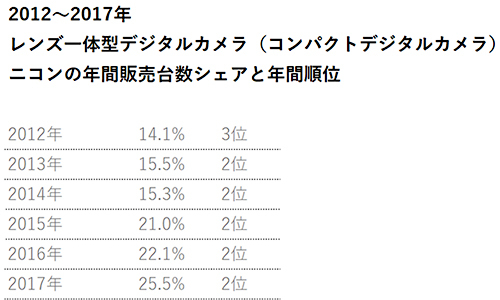 過去のデータを振り返ると、ニコンは、12年10月にシェア19.2%で初めて月間メーカー別販売台数1位に躍り出た。12年は年間では3位だったが、翌年以降は2位につけ、他社同様、高付加価値路線に舵を切りながら、縮小するコンパクトデジカメ市場で踏みとどまってきた。