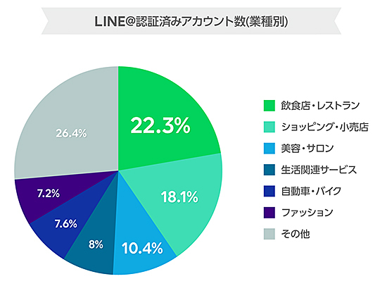 LINE@は、国内で月間7800万人(2018年9月時点)が利用するLINEのユーザー基盤を生かし、ユーザーに対してダイレクトな情報発信やビジネス活用が可能なLINEアカウント。業種別では、「飲食店・レストラン」のアカウント数が最も多く、「ショッピング・小売店」「美容・サロン」などと続いている。