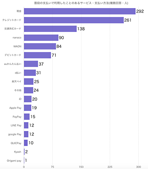 同様の調査で、最も利用されている支払い方法は「現金」であることも分かった。回答者全体の97%が「現金」を少なからず利用している。また、次いで「クレジットカード」が87%、「交通系ICカード」が46%。コード決済は、10%程度だった。