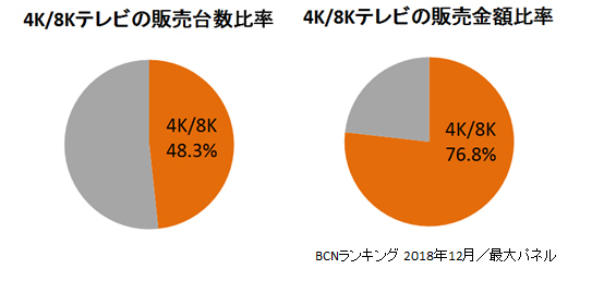 全国の主要家電量販店・ECショップからパソコン本体、デジタル家電などのPOSデータを毎日収集・集計する「BCNランキング」によると、2018年12月のテレビ全体の販売台数比率で4K以上の割合が48.3%を記録。販売金額は76.8%に達した。