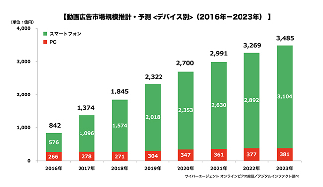 サイバーエージェントの調査によれば、17年に1374億円(前年比63%増)だった動画広告市場は、19年に約2300億円になり、22年に3000億円を突破するという。しかも、そのうちの圧倒的な比率を占めるのは、PCでなくスマホだ。