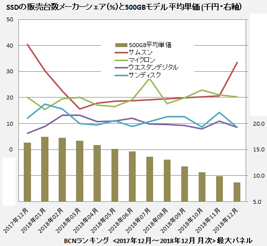SSDの主要メーカーはサムスン、マイクロン、ウエスタンデジタル、サンディスク。この4社で販売台数の7割を占める。特にトップ2社のサムスンとマイクロンは激しくシェア争いを繰り広げている。2018年の年間販売台数No.1企業はサムスン。22.4%のシェアを獲得し、ナンバーワンメーカーを表彰する「BCN AWARD」のSSD部門を受賞した。しかし、2位マイクロンも年間販売台数シェアは20.0%と健闘。その差わずか2%とあまりと僅差だ。
