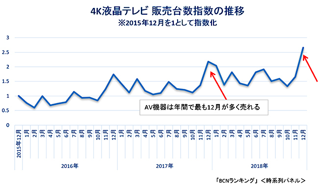 年間で最もAV機器が売れるのは12月。家電量販店・オンラインショップの実売データを集計した「BCNランキング」によると、4K対応液晶テレビの販売台数は前年同月比122.3%を記録。一時期は倍増に近いペースで伸び、今も二桁増と、売れ行きは好調だ。