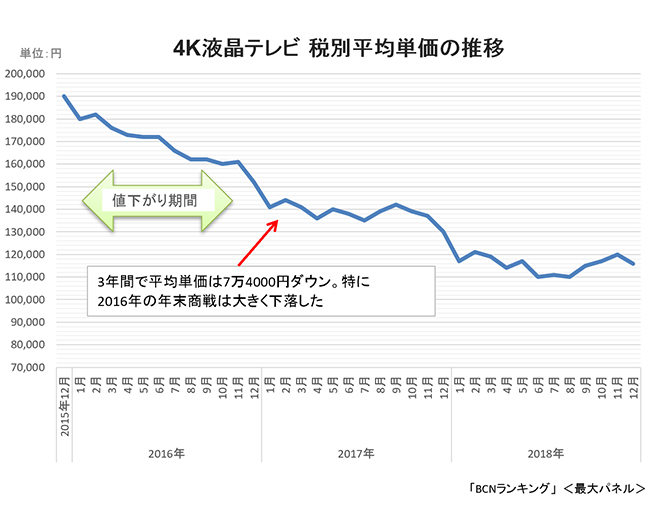 過去3年までさかのぼって、4K液晶テレビの税別平均単価をみると、2016年3月に17万6000円と初めて18万円割れの水準に突入した。翌4月はさらに安くなり17万3000円と過去最安を更新。その後、16年夏から17年夏にかけて大きく下落し、ここ1年は11万円~12万1000円の間で上下している。直近の18年12月の平均単価は、前月より少し下がって11万6000円だった。