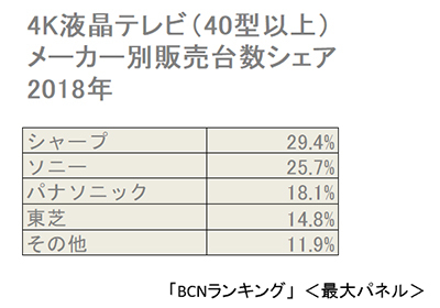 画面サイズ別にみると、40型以上の4K/8K対応液晶テレビの年間販売台数No1メーカーは、15年がシャープ、16年がソニーで、17年は再びシャープが首位の座を奪還した。18年は引き続きシャープがトップで、シェアは29.4%を占めた。