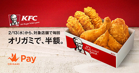 Origamiは、「オリガミで、半額。」キャンペーンの第三弾をケンタッキーフライドチキンのOrigami Pay導入する116店舗で2月13日から2月19日まで実施する。