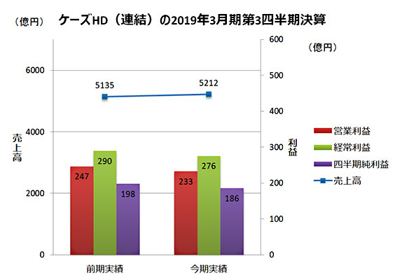 ケーズホールディングス(ケーズHD)が2月4日に発表した2019年3月期第3四半期(4~12月)の累計連結決算は、売上高が5212億5000万円(前年同期比1.5%増)、営業利益が233億1000万円(5.8%減)、経常利益が276億6600万円(4.9%減)、親会社株主に帰属する四半期純利益が186億5800万円(6.2%減)の増収減益となった。