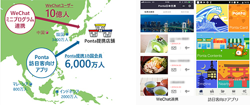 WeChatとの連携では、Ponta提携店舗をはじめとした店舗情報やクーポンを配信。WeChat内にあるインストール不要のクラウドアプリ「ミニプログラム」によって、顧客企業の情報を紹介して訪日中国人の集客も図っていく。中国からの訪日客への対応は、Pontaとして初となる。