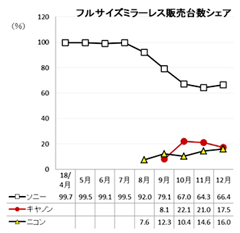 「フルサイズミラーレスでもNo.1を獲る」とキヤノン側の鼻息は荒いが、先行するソニーとの差は現時点ではまだ大きい。昨年12月時点でソニーは同市場の販売台数シェアで66.4%を占めているのに対して、キヤノンは17.5%にとどまっている。「EOS RP」だけで50%近い差を一気に埋めるのは容易なことではない。