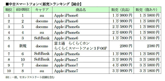 ドコモでトップ10入りしたAndroid端末は、3位に2015年7月発売の富士通「らくらくスマートフォン3 F-06F」、5位に16年冬モデルのソニー「Xperia XZ SO-01J」、7位に13年10月発売の富士通「ARROWS NX F-01F」、8位に16年夏モデルのソニー「Xperia X Performance SO-04H」、9位に14年10月発売のソニー「Xperia Z3 SO-01G」、10位に15年6月発売のシャープ「AQUOS EVER SH-04G」となった。