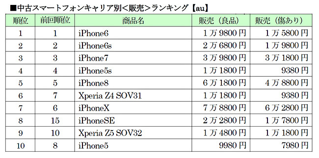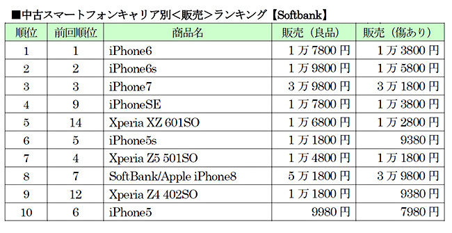 同じように、auでは6位と9位にソニー「Xperia Z4 SOV31」「Xperia Z5 SOV32」が入り、それ以外はすべてiPhone。ソフトバンクでも、5位と7位と9位にソニー「Xperia XZ 601SO」と「Xperia Z5 501SO」、「Xperia Z4 402SO」が入り、それ以外はすべてiPhoneとなっている。