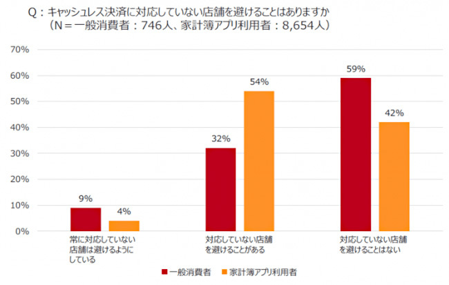 なお、消費者の半数近くがキャッシュレス決済を利用できる店舗を選択している傾向があるとのことだ。746人の一般消費者と8654人の家計簿アプリ利用者に対して、「キャッシュレス決済に対応していない店舗を避けることがありますか」と質問したところ、「常に避ける」「避けることがある」という回答を合わせると、一般消費者が41%、会計簿アプリ利用者が55%だったという。