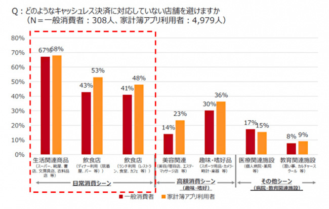 また、「どのようなキャッシュレス決済に対応していない店舗を避けますか」という質問に対しては、生活関連商品や飲食店などの日常消費シーンが多かったとのことだ(N=一般消費が308人、家計簿アプリ利用者が4979人)。
