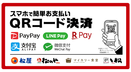 松屋フーズホールディングスは、運営する「松屋」「松のや・松乃家・チキン亭」「マイカリー食堂」「ヽ松(てんまつ)」で、「PayPay」「LINE Pay」「楽天ペイ(アプリ決済)」「WeChat Pay」「Alipay」と5種類のQRコード決済サービスを2月19日16時から使えるようにした。