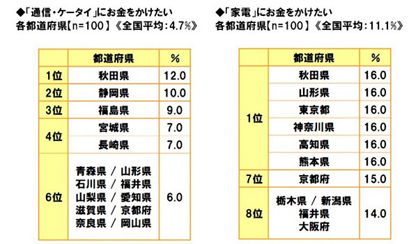 インターネットリサーチの中で、「通信・ケータイ」にお金をかけたいかどうかを聞いたところ、1位が「秋田県」で12.0%だったという。「家電」では、1位に「秋田県」「山形県」「東京都」「神奈川県」「高知県」「熊本県」の6都県が同率16.0%で並んだ。