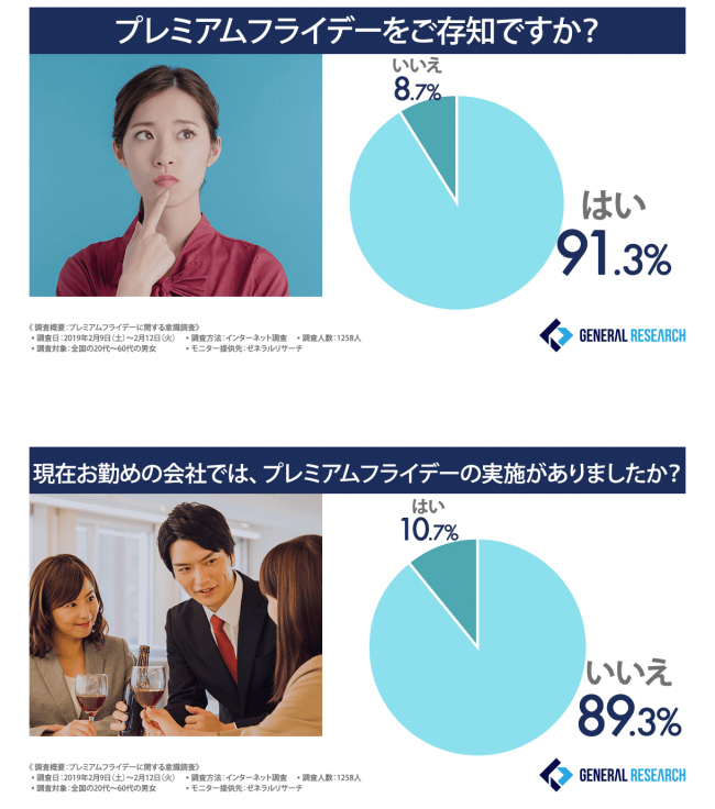 ゼネラルリサーチが2月9日~2月12日に全国20~60代の男女1258名を対象にインターネットで実施した「プレミアムフライデーに関する意識調査」によると、「認知率」は9割を超えているものの、「実施された」と回答したのはわずか1割にとどまった。衝撃の結果というべきか、予想通りの結果というべきか判断が難しいところだが、「知ってはいるけど、自分には関係ない」という人が圧倒的多数であることは確かだ。