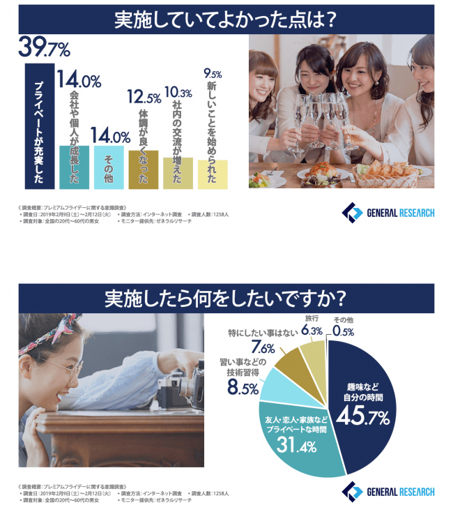 一方、「実施されなかった」と回答した人に聞いた「実施したら何をしたいか」という質問では、45.7%が「趣味など自分の時間」、31.4%が「友人・恋人・家族などプライベートな時間」と回答。実施の有無にかかわらず、プレミアムフライデーに期待しているのは“個人”の時間の充実であることは共通しているようだ。