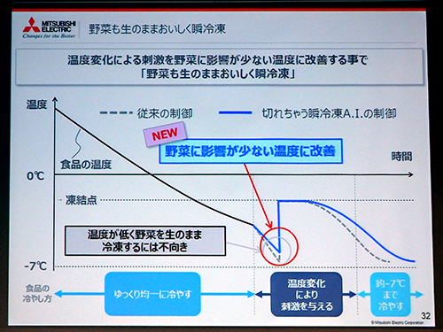 「瞬冷凍」は、通常は凍ってしまう凍結点を過ぎても食品が凍結しない過冷却現象を応用した三菱独自の冷凍技術。過冷却状態の食品に温度変化による刺激を与えることで、一瞬で氷核を形成し細胞破壊を抑えおいしく冷凍する技術だが、今回、野菜にも影響が少ない温度で刺激を与えることで、野菜を生のまま瞬冷凍することに成功したのだ。