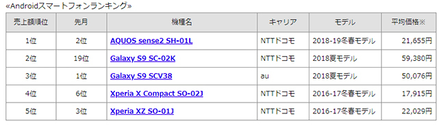 Androidに絞った中古スマホのランキングでは、1位がNTTドコモの「AQUOS sense2 SH-01L」で2万1655円だった。