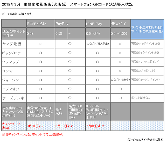 2019年3月1日現在、導入している「QRコード」方式のモバイル決済サービスの種類が最も多い家電量販店はエディオンとケーズデンキ。3月1日から「d払い」を導入したビックカメラグループ(ビックカメラ・ソフマップ・コジマ)、ジョーシンも多い。ヤマダ電機はPayPayのみ。なお、ケーズデンキは最後発となり、記事作成中の3月8日に全店舗でLINE Pay、d払い、PayPay、楽天ペイ(アプリ決済)、Origami Pay、Alipay、WeChat Payの各種バーコード決済の取り扱いを開始した。今後、au PAY、メルペイなども随時導入するという。