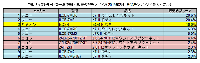 19年2月の機種別ランキングでも、ソニーがトップテン内に6機種がランクイン。一方、キヤノンは「EOS R ボディ」の1機種が3位に入るのみと苦戦を強いられている。