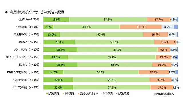 MMD研究所は、利用率が高かった格安SIMの上位9サービスを利用している15~69歳の男女1350人を対象に「2019年3月格安SIMサービスの満足度調査」を実施した。期間は2月22~28日。