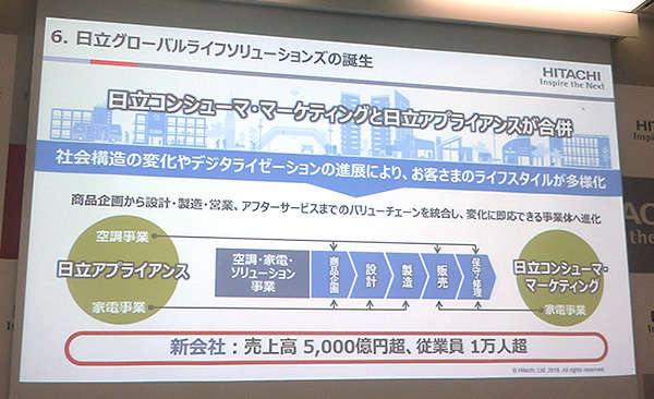 新会社は、日立製作所の100%子会社で資本金が200億円、売上高が約5000億円、従業員数が約1万1300人。製造を担う日立APと販売・保守を担う日立CMが合併する狙いについて谷口社長は、「これまでの大量生産やマスをターゲットにしたマーケティングから、製品そのもののライフサイクルが短くなり、製造と販売が連携しながらスピードアップすることができる」と語った。